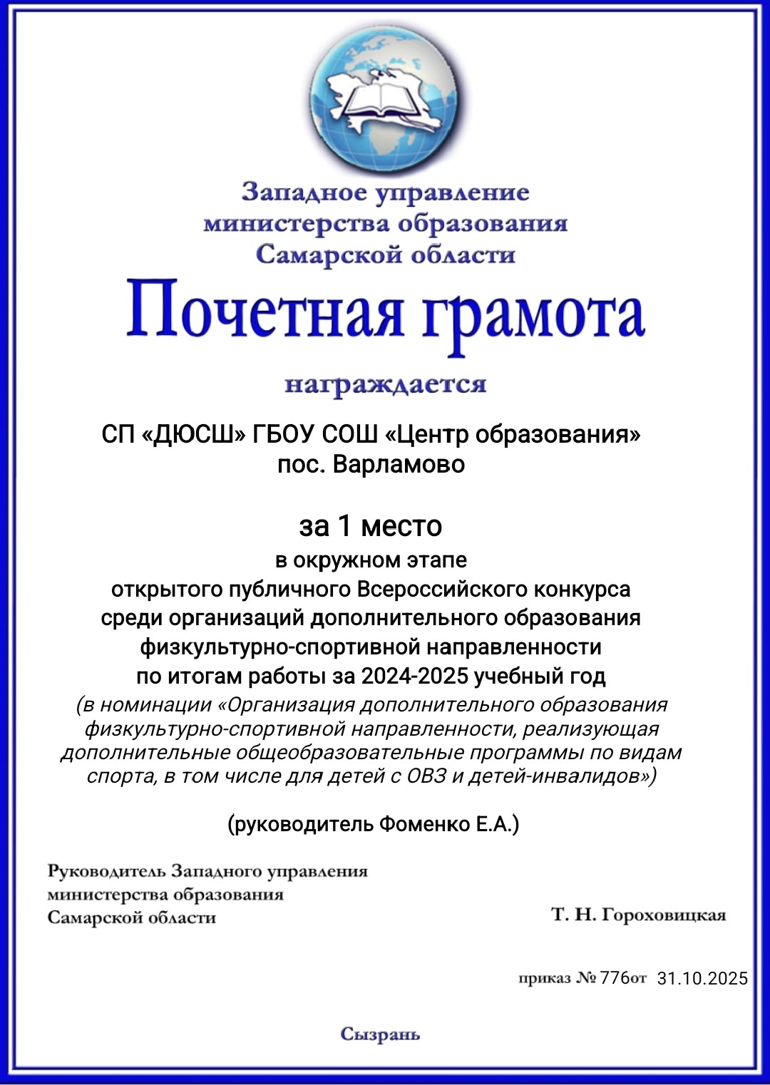 Хотим поделиться радостной новостью! Структурное подразделение «ДЮСШ» ГБОУ СОШ «Центр образования» пос. Варламово стало победителем окружного этапа Всероссийского конкурса среди организаций дополнительного образования физкультурно-спортивной направленности по итогам работы за 2924-2025 учебный год.